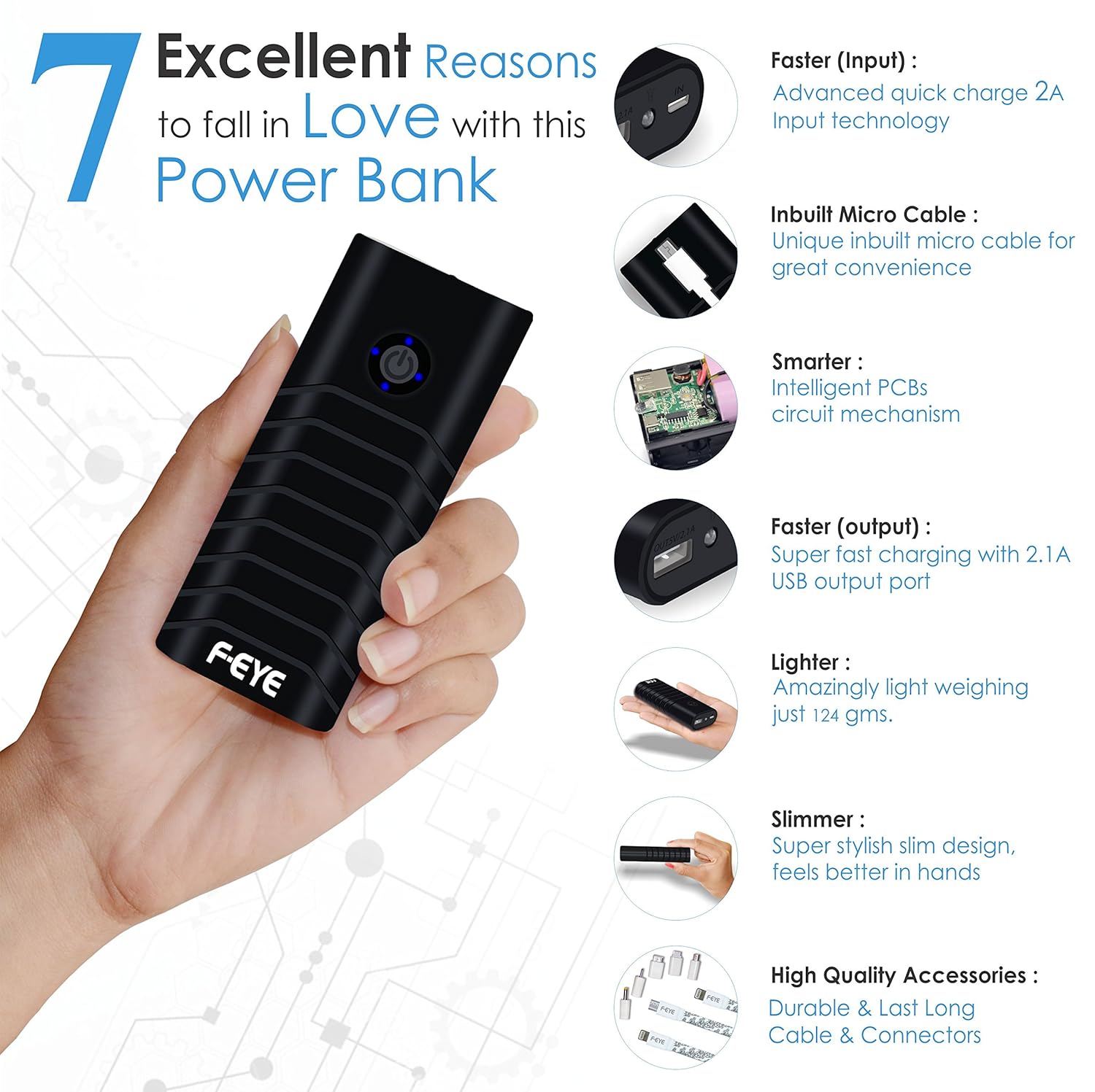 bank with inbuilt micro cable and ultra fast charging 2.1A USB output port.